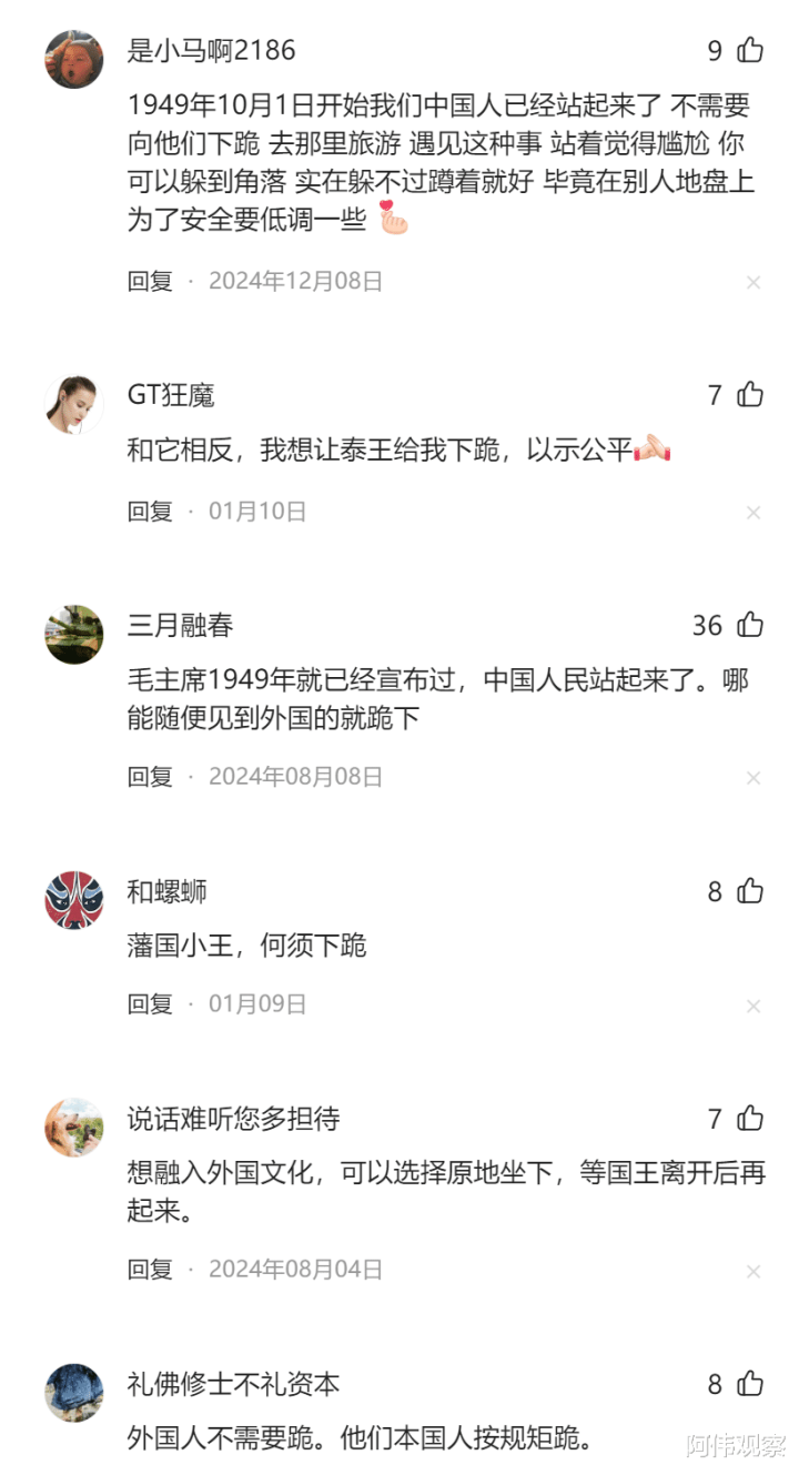 有网友说,冲着这个习俗,我根本不会去泰国旅游,就是遇见,我也不会委屈自己的膝盖。我国早就把这些东西狠狠踩到泥土里了,有点文化就不会盲从!