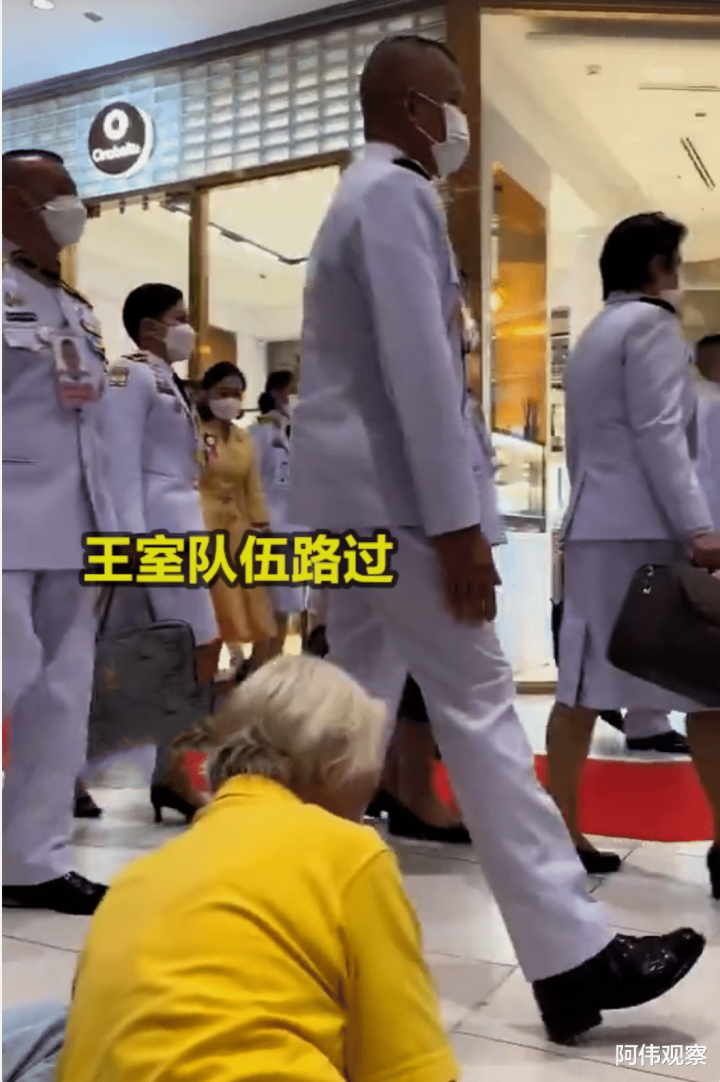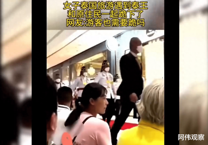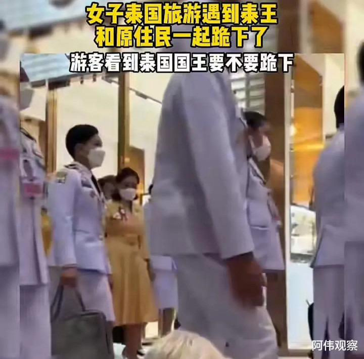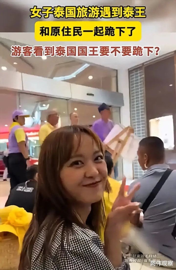 我国女子去泰国旅游不小心遇到泰国国王了,泰国国民遇见国王下跪,我国女子也跟着下跪。